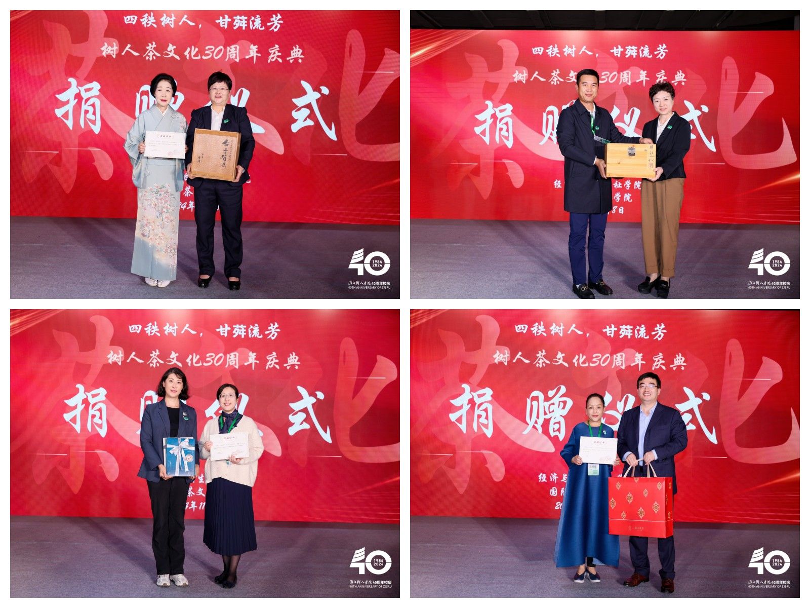 庆典会上举行了隆重的捐赠仪式。中国茶叶博物馆、日本国际茶道香道丹月流、武夷山玖鹤茶业有限责任公司、张译尹女士、印宗法师、以及校友代表们等都纷纷捐赠了珍贵的图书、日本茶具及收藏级别的大红袍、剪雪裁冰唐煮茶饼、手绘壶与点茶器具等。这些捐赠不仅是对树人茶文化专业发展的有力支持,更是对传承与弘扬中国茶文化的共同努力。