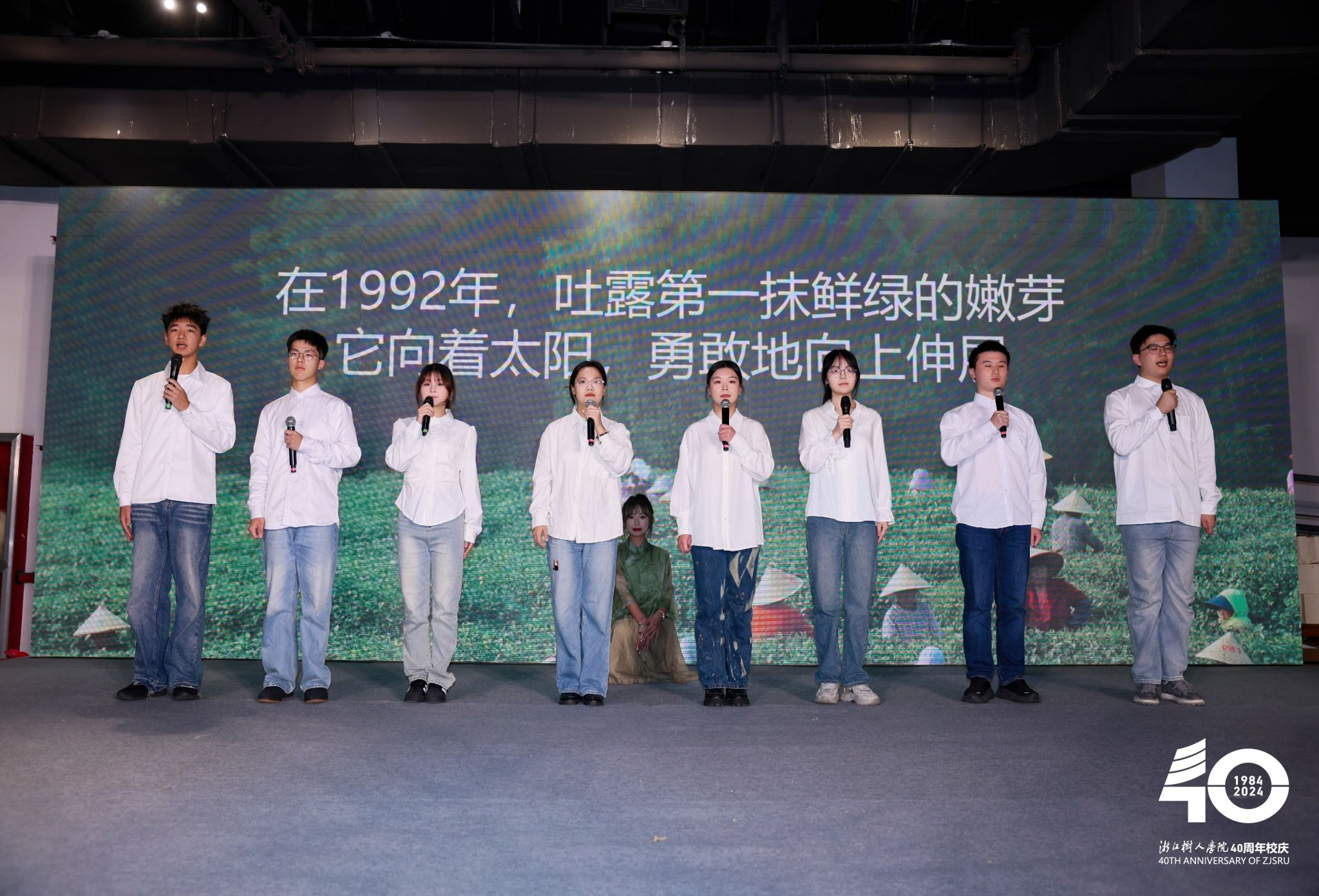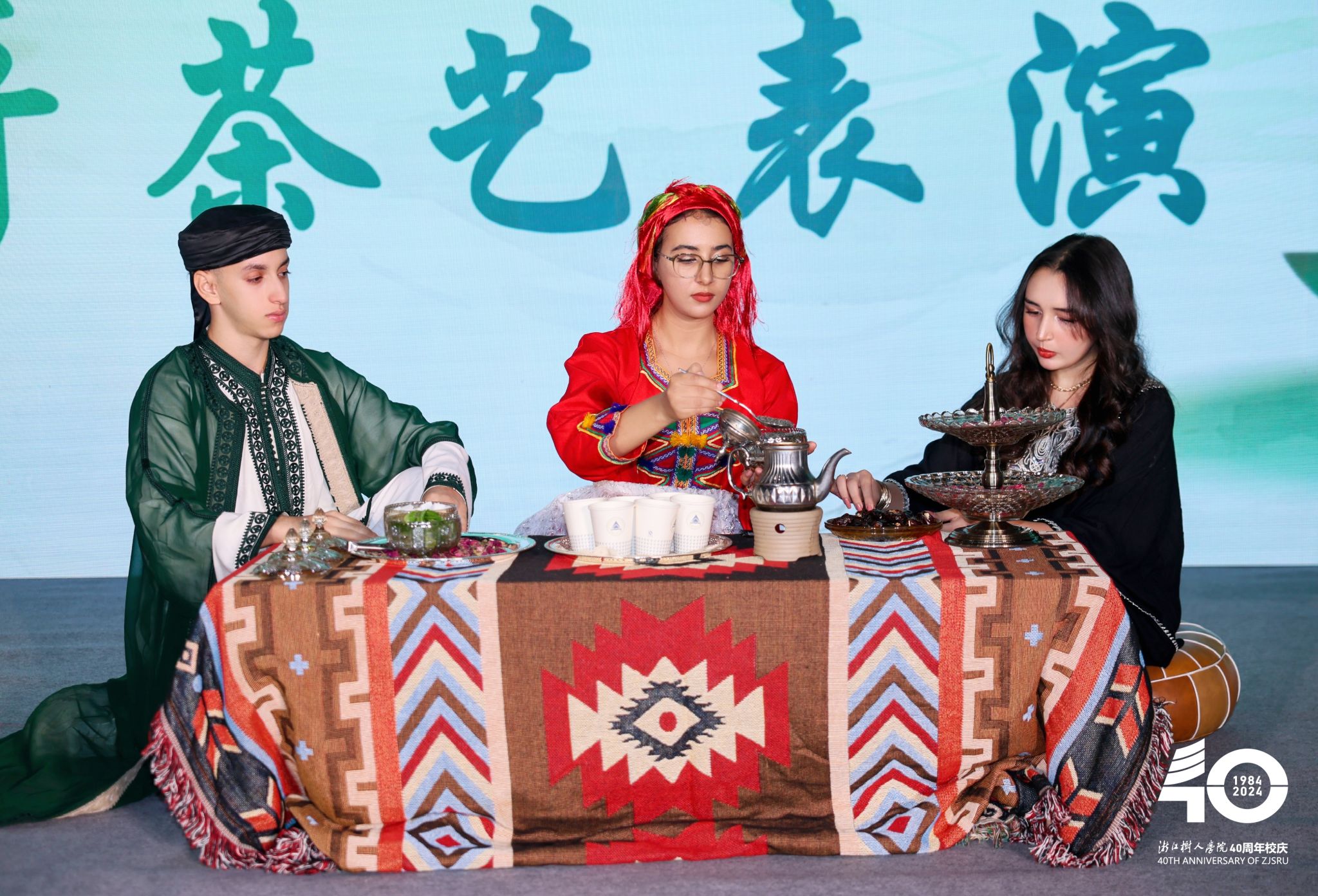 来自中国茶叶博物馆的“浙江工匠”许泽梅代表校友上台发言,并带来了她教授的摩洛哥风情茶艺表演,为现场观众展示了异国风情茶文化盛宴。现场还播放了校友们录制的视频,表达了他们对母校的深情厚谊和对树人茶文化未来的美好祝愿。8位在校生代表朗诵了创作作品《一棵茶树》,回顾初生,展望未来,表达了他们对茶文化专业的热爱之情。