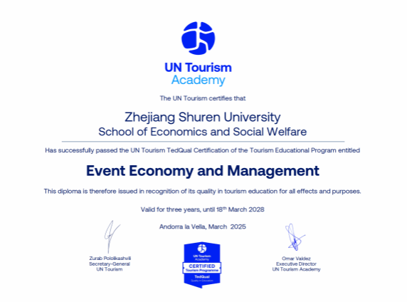 2025年3月,联合国旅游组织旅游教育质量认证中心正式公布认证结果,我院旅游管理专业、会展经济与管理专业通过联合国世界旅游组织旅游教育质量国际认证(UN Tourism.TedQual Certification),认证得分788分(满分845分,得分率93%),以优秀等级获得长达三年年限的国际认证(2025年3月18日至2028年3月18日)。