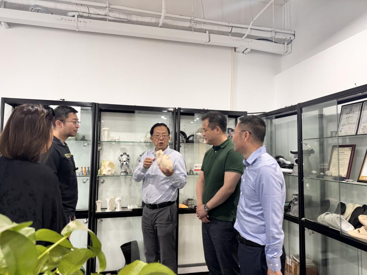 院长阎洪教授一行率先对浙江树人学院数字技术管理研究院校外基地进行了实地考察。期间,联建单位领导对基地的主营业务、产品特色与亮点以及未来发展方向进行了全面而深入的介绍。浙江坤维增材科技有限公司作为一家高科技企业,主要从事3D打印、增材制造装备制造等业务,其制造的3D打印产品广泛应用于医学、航运、装备制造等领域。