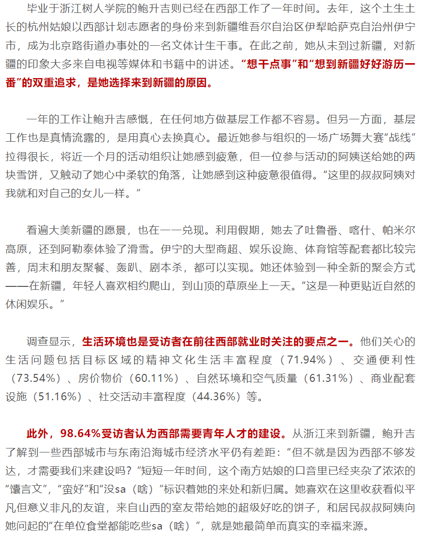 毕业于浙江树人学院的鲍升吉则已经在西部工作了一年时间。去年,这个土生土长的杭州姑娘以西部计划志愿者的身份来到新疆维吾尔自治区伊犁哈萨克自治州伊宁市,成为北京路街道办事处的一名文体计生干事。在此之前,她从未到过新疆,对新疆的印象大多来自电视等媒体和书籍中的讲述。“想干点事”和“想到新疆好好游历一番”的双重追求,是她选择来到新疆的原因。