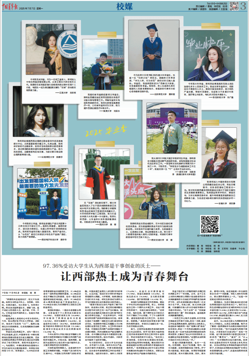 7月7日,在共青团中央公众号发布的文章《毕业去西部,因为需要,因为梦想》和《中国青年报》刊发的文章《97.36%受访大学生认为西部是干事创业的沃土——让西部热土成为青春舞台》中,我校西部计划志愿者会展经济与管理201班鲍升吉获报道关注。